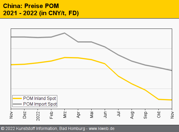 Die Preise für alle technischen Thermoplaste auf dem chinesischen Markt sind im November gesunken. Besonders schwach waren die Werkspreise für POM sowie PBT mit Abschlägen im zweistelligen Prozentbereich. Vorprodukte wie Benzol, Paraxylol, Butandiol, Caprolactam und Bisphenol-A gaben im November ebenfalls deutlich nach. Die Nachfrage aus den meisten Sektoren – einschließlich der zuletzt durchaus robusteren Textil- und Haushaltsgeräteindustrie – blieb gedämpft, während sich die Kaufaktivität im Automobilsektor stabil präsentierte.