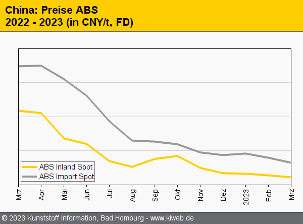 Die Mehrzahl der Notierungen der technischen Thermoplaste in China gab im März nach, vor allem, weil die Nachfrage aus den entsprechenden Abnahmesektoren nicht so deutlich anzog wie erwartet. Gleichzeitig stieg die Produktion unter anderem von ABS und PA 6. Zweiter Grund für die Abschläge, die in der Spitze bis zu 10 Prozent erreichten, waren die niedrigeren Vorproduktkosten, die sich am sinkenden Ölpreis orientierten. Eine der wenigen Ausnahmen war POM, dessen Preis wegen niedriger Lagerbestände im März leicht anzog, ebenso wie der von PA 6.