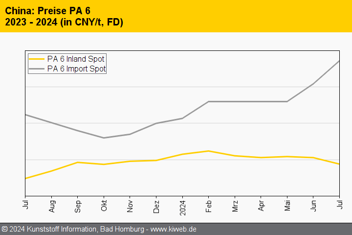 Die monatlichen Durchschnittspreise für die Mehrzahl der berichteten technischen Thermoplaste auf dem chinesischen Markt tendierten im Juli seitwärts oder leicht schwächer. Stark nach unten zog es Polyamid 6 und insbesondere POM. Hintergrund waren die saisonal schwache Nachfrage und tiefere Vorproduktpreise.