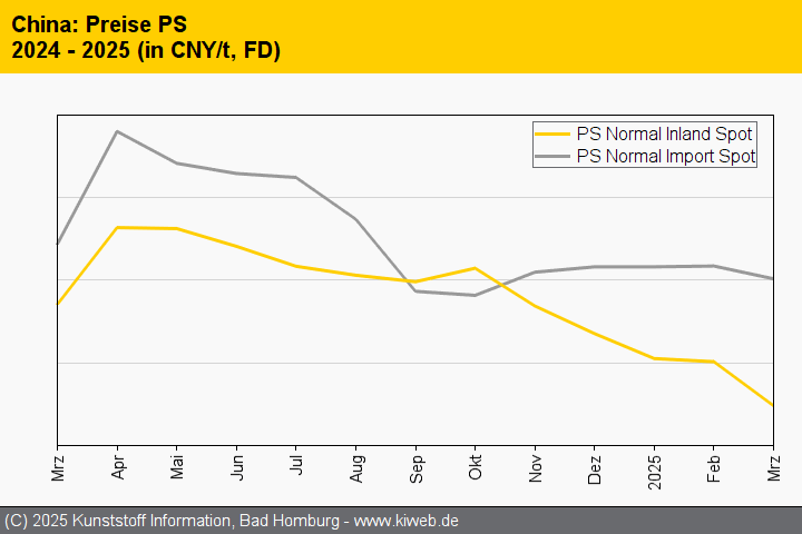 Die Durchschnittspreise fast aller Standardkunststoffe auf dem chinesischen Markt gaben im März nach. Die Ausnahme war PE-HD in Blasformqualität, das sich stabil hielt. Besonders bei Polyethylen und PVC sorgten eine schwache Nachfrage aus der Verarbeitungsbranche sowie das auskömmliche Angebot für sinkende Preise. Bei Polypropylen, Polystyrol und PET bestimmten vor allem rückläufige Rohstoffpreise die Richtung.