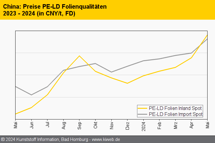 Die monatlichen Durchschnittspreise der meisten Standard-Thermoplaste in China kletterten im Mai höher. Ausnahmen waren Polystyrol und PET, deren Notierungen hauptsächlich aufgrund der niedrigeren Vorproduktpreise nachgaben – befeuert von den günstigen Rohölpreisen. Preistreiber war vor allem die Hoffnung auf bessere Aussichten für die heimische Konjunktur, die die Regierung in Peking mit einer Reihe von Maßnahmen stützen will. Zu den Plänen gehören die Förderung der Erneuerung von Großanlagen und ein Tauschprogramm für Konsumgüter. Der strauchelnden Immobilienbranche will Peking durch Staatsanleihen im Gesamtwert von einer Billion Yuan (rund 128 Mrd EUR) unter die Arme greifen. Außerdem senkte die Zentralbank erneut den Leitzins. und Banken wurden angewiesen, ihre Kreditvolumina zu erhöhen.