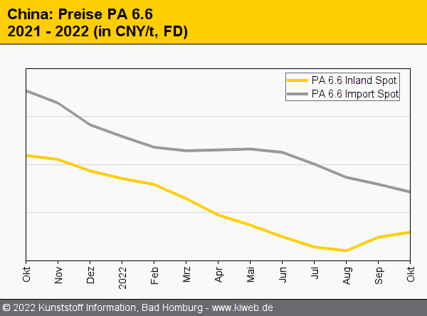 Der chinesische Markt für technische Thermoplaste gab im Oktober 2022 ein gemischtes Bild ab. Polyamid 6 tendierte wegen der schwachen Nachfrage, insbesondere aus dem Textilsektor, tiefer. POM wurde vom günstigeren Vorprodukt Methanol nach unten gedrückt. Die Preise für andere technische Kunststoffe stiegen im Oktober indes aufgrund der leicht besseren Nachfrage aus Automobil-, Verpackungs- und Elektronikindustrie.