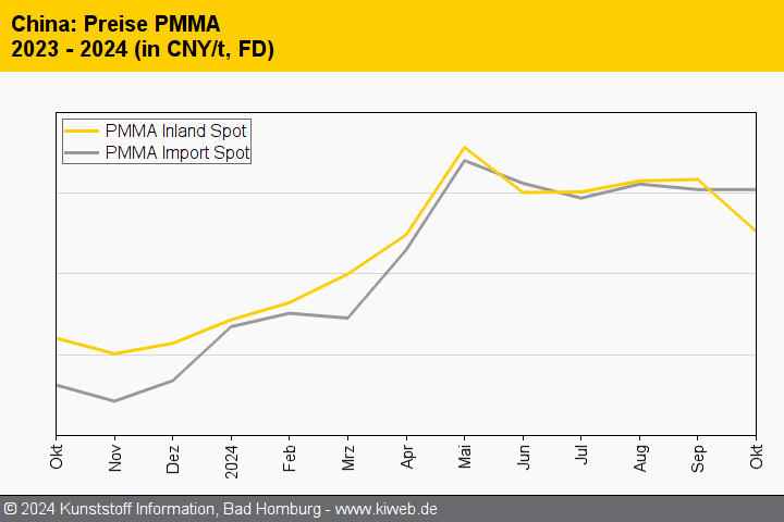 Die Preise für technische Thermoplaste auf dem chinesischen Markt entwickelten sich im Oktober 2024 uneinheitlich – wobei die Mehrzahl der berichteten Sorten tiefer tendierte. Polycarbonat und Polyamid 6.6 bewegten sich seitwärts und ABS verzeichnete eine leichte Aufwärtsbewegung. POM ging aufgrund der geringen Nachfrage leicht zurück, während die erheblich gesunkenen Vorproduktpreise sowohl bei Polyamid 6 als auch bei PMMA für einen deutlicheren Abwärtsdruck sorgten. Der einzige solide Anstieg war bei PBT zu beobachten. Zwar präsentierten sich Angebot und Nachfrage ausgewogen, doch festere Rohstoffkosten wirkten hier stützend.