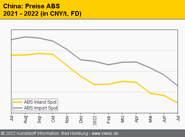 Die Preise für technische Thermoplaste waren im Juli 2022 auf dem chinesischen Markt weitgehend rückläufig. Die Vorproduktpreise fielen im Einklang mit den Rohölpreisen, und die Nachfrage war in fast allen Sektoren angesichts der Besorgnis über eine weltweite Rezession gedämpft. Dies berichtet der Branchendienst Kunststoff Information (Bad Homburg) im aktuellen Online-Report.