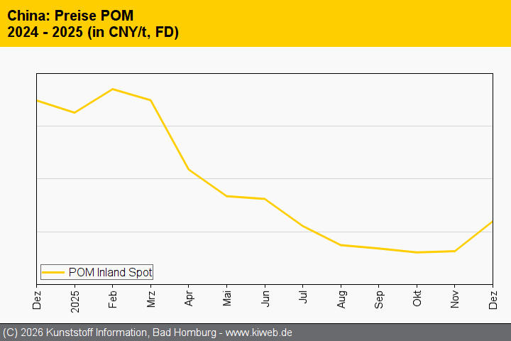 Die Entwicklung der Durchschnittspreise für technische Thermoplaste in China verlief im Dezember 2025 uneinheitlich. Die unterschiedlichen Preisbewegungen der in diesem Bericht betrachteten Sorten wurden durch divergierende Angebotsniveaus sowie eine gemischte Entwicklung der Vorproduktkosten beeinflusst. Deutliche Ausschläge zeigten lediglich POM, das infolge geringerer Versorgung, niedriger Lagerbestände und höherer Vorproduktpreise kräftig zulegte, sowie PMMA, das aufgrund fallender Vorproduktkosten und steigender Produktion deutlich nachgab.