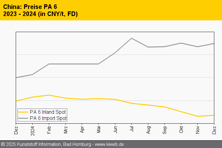 Der chinesische Markt für technische Thermoplaste zeigte im Dezember 2024 eine gemischte Entwicklung: ABS war das einzige Material, dessen Notierung stieg, nicht zuletzt wegen der höheren Butadienkosten. Im Gegensatz dazu verzeichneten PA 6.6 und PBT deutliche Preisrückgänge aufgrund eines hohen Angebots.