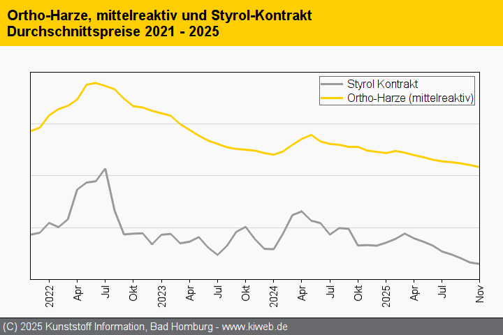 Von der üblicherweise eher zögerlichen Reaktion der Orthoharze auf Veränderungen bei den Vorprodukten war im Berichtsmonat November wenig zu sehen. Der Rückgang der Styrol-Referenz für November wurde sogar übertroffen. Auch die nachgebenden Notierungen bei den beiden anderen Vorprodukten – Malein- und Phthalsäureanhydrid – sorgten für zusätzlichen Druck.