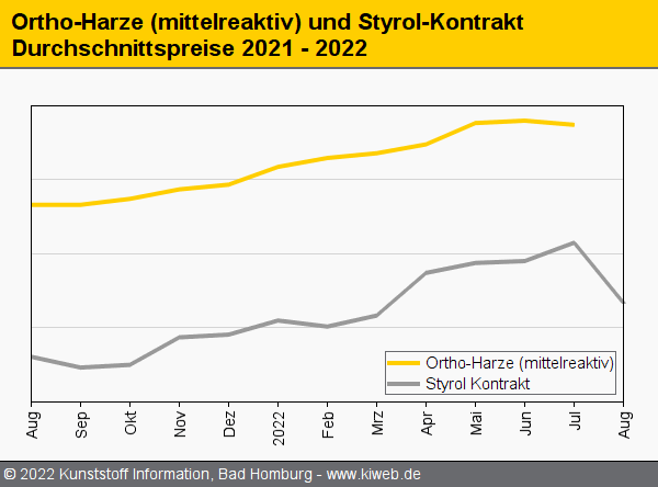 Der Markt für Orthoharze dreht nach unten. Als leichtes Nachzucken der bisherigen Juli-Kostensteigerungen für Styrol kam es hier und da zwar noch zu vereinzelten Preisanhebungen. Das Gros der Preise tendierte aber nach unten und zollte damit der schwachen Nachfrage Tribut. Dass der Bedarf nachgelassen hat, ist zu einem Teil sicherlich der Urlaubszeit geschuldet. Zu einem anderen Teil macht sich aber auch die konjunkturelle Abkühlung bemerkbar, Rezessionsängste lassen die Branchenakteure vorsichtiger agieren. Mit dem Absturz der Styrol-Referenz im August werden die Harznotierungen ihre Abwärtsbewegung mit Sicherheit fortsetzen.