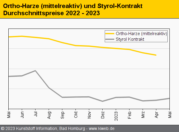 Nur wenig Wirkung hatten die Vorproduktkontrakte auf die April-Notierungen der mittelreaktiven Orthoharze. Zwar zog Styrol leicht um 19 EUR/t an, doch für alle übrigen Vorprodukte gab es Abschläge, sogar deutliche wie etwa für den Q2-Kontrakt für Maleinsäureanhydrid, der um 200 EUR/t tiefer fixiert wurde. Vor diesem Hintergrund gaben im Wesentlichen die sehr schwache Nachfrage aufgrund der Inflation sowie eine zumindest teilweise Rücknahme der Energiekostenzuschläge den Ton an. Dies berichtet der Branchendienst Kunststoff Information (KI, Bad Homburg) im aktuellen Online-Report.