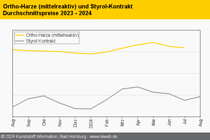Die Abschläge bei den berichteten mittelreaktiven Orthoharzen setzten sich im Juli 2024 fort, nachdem das Hauptvorprodukt Styrol seit Mai mittlerweile um fast 280 EUR/t nachgelassen hat. Die weiterhin schwache Nachfrage und die ordentliche Verfügbarkeit förderten die Entwicklung zusätzlich. Der bisherige Abschwung des Styrol-Kontrakts ist allerdings eingepreist, sodass es eigentlich nicht noch einmal zu spürbaren Rücknahmen kommen sollte. Ende Juli deutete sich bereits eine Bodenbildung an. Ob sich andererseits der Aufwärtstrend, den Styrol aktuell erlebt (+78 EUR/t), bereits in den Harzpreisen für August niederschlagen wird, ist angesichts der dünnen Auftragslage fraglich.