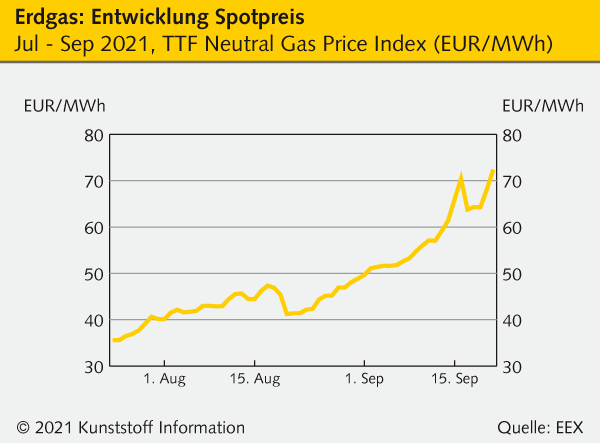 Mit ähnlicher Argumentation hatte der PVC-Erzeuger Kem One (Lyon / Frankreich) vor wenigen Tagen eine Preiserhöhung für PVC von 40 EUR/t angekündigt – obwohl der maßgebliche Ethylenpreis zuvor leicht gesunken war. Aus anderen Branchen ist darüber hinaus zu hören, dass aus dem gleichen Grund Düngemittelhersteller ihre Produktionen gedrosselt haben. Der norwegische Hersteller Yara beispielsweise fährt die europäischen Ammoniak-Anlagen seit Mitte September nur noch mit 60 Prozent der Nennkapazität.