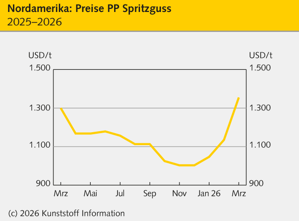 Die höheren Vorproduktpreise trieben die Preise auf den nordamerikanischen Polymermärkten im März 2026 deutlich nach oben, wobei die Aufschläge bei den technischen Thermoplasten von der schwachen Nachfrage begrenzt wurden. Besonders stark zogen die Polyolefine an, da die Exportnachfrage deutlich höher ausfiel. So fragten internationale Kunden verstärkt US-Material nach, weil der Iran-Krieg die internationalen Handelsrouten und die Versorgung aus dem Nahen Osten beeinträchtigt, berichtet der KI-Kooperationspartner RTi (Fort Worth, Texas / USA).