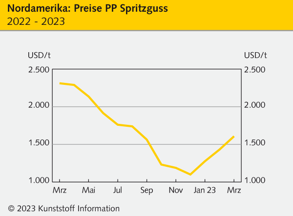 Die nordamerikanischen Polymermärkte zeigten sich im März 2023 uneinheitlich. Polyolefine und Polystyrol zogen teils kräftig an, die Preise für Polyamid 6 hingegen tendierten weiter steil nach unten. Die übrigen Sorten bewegten sich kaum. Besonders schwach präsentieren sich weiterhin die technischen Thermoplaste. Neben den zumeist tieferen Produktionskosten blieben die Abrufe auch im letzten Monat des ersten Quartals 2023 überaus schwach. So liegt der Bausektor weiterhin brach. Leicht bergauf geht es in der Automobilproduktion.
