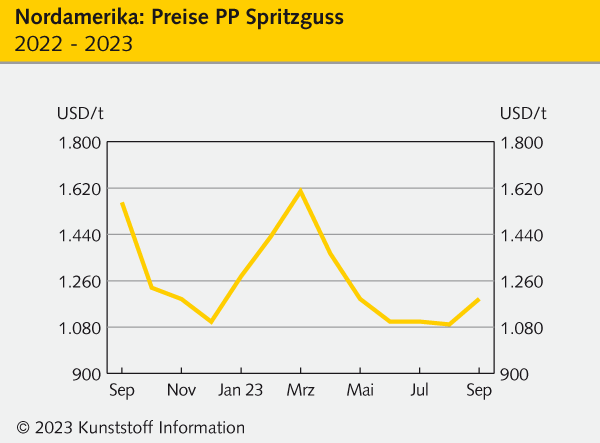 Die Preise an den nordamerikanischen Polymermärkten tendierten im September 2023 uneinheitlich. Während die Polyolefine und Polystyrol deutlich anzogen, bestimmten Rollover und Abschläge die anderen Segmente. Bemerkenswert ist die Preisschwäche trotz der zuletzt deutlich festeren Vorproduktpreise. So zogen Ethylen, Propylen, Benzol und Butadien deutlich an. Treiber waren höhere Rohölpreise sowie in einigen Segmenten Ausfälle in der Produktion.