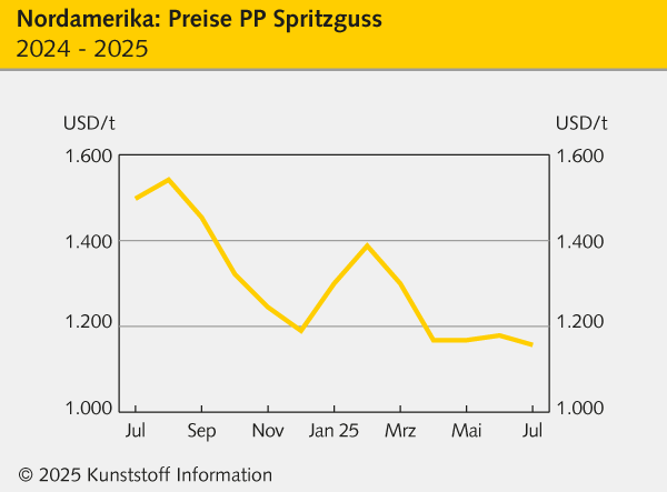 Im Juli 2025 präsentierten sich die Polymerpreise auf den nordamerikanischen Märkten uneinheitlich. Während Polyethylen und Polystyrol moderate Preisanstiege verzeichneten, gaben die Notierungen für Polypropylen und Polyamid 6 nach. PVC, Polycarbonat, ABS und Polyamid 6.6 blieben weitgehend unverändert. Insgesamt spiegelte sich in der Preisentwicklung das Zusammenspiel aus schwacher Nachfrage, hohen Lagerbeständen und gestiegenen Vorproduktkosten – insbesondere bei Ethylen, Benzol und Caprolactam – wider.