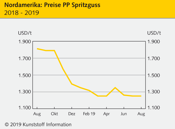 Die nordamerikanischen Polymermärkte zeigten sich im August 2019 im Sommerschlaf. Maue Nachfrage und mit Ausnahme von Benzol geringe Änderungen in den Vorproduktpreisen erlaubten Abnehmern, Rollover oder Abschläge zu realisieren. Für Polyethylen-Produzenten klafften Wunsch und Wirklichkeit wieder einmal weit auseinander. Statt der ersehnten Erhöhungen ging es auch im August weiter bergab. Auch PVC und Polystyrol gaben nach. Polypropylen folgte 1:1 der Vorgabe durch C3 und wurde daher im Rollover fixiert. Die technischen Thermoplaste stehen derweil auch in Nordamerika weiterhin unter Abwertungsdruck. Das berichtet der Branchendienst KI Kunststoff Information (Bad Homburg) im aktuellen Regionenreport.