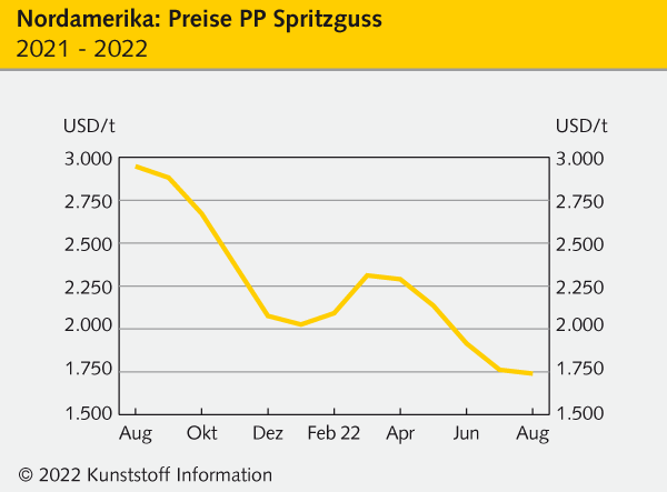 Die nordamerikanischen Polymermärkte sahen im August 2022 durch die Bank Abschläge. Selbst Polystyrol und Polyamid 6 schafften durch die Beruhigung am Benzol/Styrol-Markt die Trendwende. Auch die übrigen Vorprodukte gaben mit den fallenden Rohölnotierungen überwiegend nach. Dies berichtet der Branchendienst Kunststoff Information (KI, Bad Homburg) im aktuellen Online-Report.