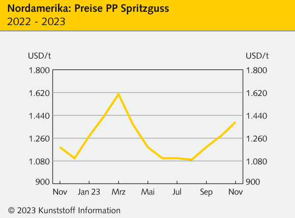 Die Preise an den nordamerikanischen Polymermärkten tendierten im November 2023 seitwärts bis tiefer. Einzige Ausnahme war Polypropylen, das wegen der höheren Notierungen für Polymer Grade Propylen noch einmal zulegte. An allen Märkten dominiert weiterhin das Bild von flauer Nachfrage bei gleichzeitig guter Verfügbarkeit. Erhöhungswünsche der Produzenten in einigen Segmenten entbehrten jeder Grundlage und konnten erfolgreich abgeschmettert werden. Am Polyethylen-Markt stabilisierte sich die Produktion nach den diversen Ausfällen. Der zusätzliche Ausstoß trug zum weiteren Anschwellen der Lagerbestände bei.