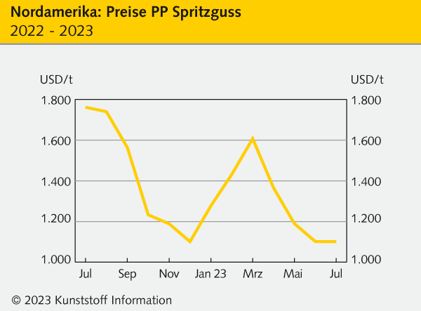 Für die Preise an den nordamerikanischen Polymermärkten ging es im Juli 2023 erneut seitwärts bis tiefer. Besonders die technischen Thermoplaste präsentierten sich weiterhin schwach, während die Polyolefine und PVC ihre Abwärtstrends jeweils mit einem Rollover beenden konnten.