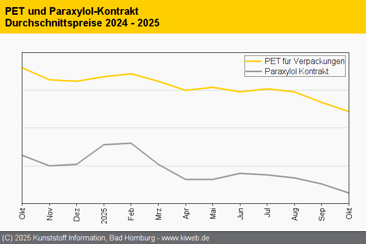Der westeuropäische Oktober-Kontrakt für Paraxylol (PX) wurde mit einem Minus von 30 EUR/t bei 735 EUR/t fixiert. Wieder einmal blieb dem europäischen Markt nichts anderes übrig, als dem leichteren asiatischen Leitmarkt zu folgen. An den trüben Marktbedingungen hierzulande wird sich wohl kaum etwas ändern. Dennoch ist nur noch von geringfügigen Abschlägen bei PET auszugehen, denn die preisliche Talsohle ist weitgehend erreicht. Dies berichtet der Branchendienst Kunststoff Information (KI, Bad Homburg) im aktuellen Online-Report.