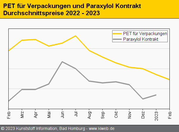 Die Hoffnung der europäischen PET-Produzenten auf eine Stabilisierung der Preise zerstob zu Beginn des Februars schnell. Anfang des Monats wurde nach langer Verzögerung die Dezember-Referenz für PX bekannt gegeben. Der satte dreistellige Abschlag führte umgehend zu entsprechenden Abschlagsforderungen der Abnehmer. Zugleich drängten aggressive Importangebote auf den Markt. Das Strohfeuer dauerte jedoch nicht lang. Im Monatsverlauf wurden die Abschläge auf das Nötigste eingegrenzt, auch in Folge des verheerenden Erdbebens in der Türkei, das dort die Flaschennachfrage schlagartig anschwellen ließ. Die aufschäumende Volatilität in den internationalen Märkten trieb die hiesigen Verarbeiter zurück an die zuverlässig gefüllten Tröge der europäischen Anbieter. Sie setzten oft auf „Nummer sicher“, um den Bedarf der sich nähernden Frühjahrssaison zu decken.