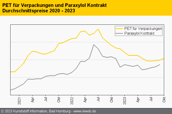 Die anhaltende Misere des europäischen PET-Marktes scheint im Oktober 2023 einen weiteren Kulminationspunkt erreicht zu haben. Die Nachfrage blieb wie gehabt auch in der beginnenden Nachsaison deutlich unter dem normalen Niveau. Aus wirtschaftlichen Gründen avisierte der Erzeuger JBF Global Mitte Oktober die Schließung auch des zweiten der beiden Stränge im belgischen Geel zum Ende des Monats. Im Sog dieser Ankündigung kam es zu einer breiten Streuung der nach wie vor relativ geringen Zahl von Abschlüssen. Unter dem Strich gelang es den europäischen Erzeugern, in den regulären Geschäften zumindest Teile der PX-Kostenerhöhungen umzusetzen.
