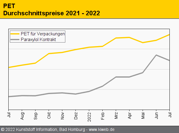 Auch im Juli 2022 setzten sich die Turbulenzen im europäischen PET-Markt fort. Das maßgebliche Vorprodukt PX wurde sehr knapp und verteuerte sich immens, zusätzlich befeuert durch den Verfall des Euro-Kurses. Die europäischen Erzeuger drosselten somit nicht mehr nur freiwillig, sondern tatsächlich notgedrungen aus Rohstoffmangel die Produktion.