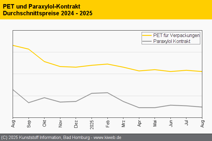 Wie erwartet blieb der europäische PET-Markt im August 2025 weiter im Brackwasser liegen. An höhere Preise war für die europäischen Erzeuger daher nicht einmal entfernt zu denken. Andererseits gab es trotz günstiger Importe keinen Grund zu stärkeren Preissenkungen. Denn auch diese hätten die am Boden liegende Nachfrage nicht wirklich beleben können. Dies berichtet der Branchendienst Kunststoff Information (KI, Bad Homburg,) im aktuellen Online-Report.