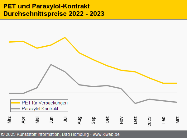 Der europäische PET-Markt zeigte sich im März sehr volatil. Zu Beginn des Monats konnten frei flottierende Mengen noch teilweise mit Abschlägen von bis zu 50 EUR/t ergattert werden. Viele Abnehmer hielten sich nach der Regel des „fallenden Messers“ folgerichtig zunächst zurück. Nach dem ersten Monatsdrittel drehte die Situation jedoch, nachdem die Importnotierungen wegen stark steigender Preise in China und Asien deutlich anzogen. Spätestens mit der Bekanntgabe der europäischen PX-Kontraktreferenz für März, die nur marginal nachließ, zogen die europäischen Lieferanten dann die Schrauben an. Insbesondere die größeren Mengen am unteren Rand der Bandbreite erhielten so leichte Aufschläge, die freieren Mengen am oberen Rand wurden dagegen meist im Rollover durchgereicht.