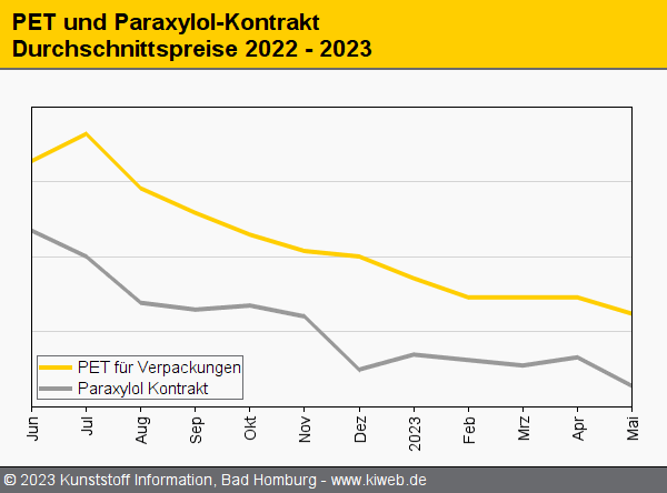 Der erhoffte lebhafte Saisonbeginn im europäischen PET-Markt fiel im Mai 2023 buchstäblich ins Wasser. Die Wassermassen, die bis weit in den Monat hinein große Teile von Europa überfielen, bremsten die ohnehin schon durch Inflation und weitere krisenhafte Entwicklungen stark getrübte Verbraucherlaune auch im Bereich der Getränke nochmals verstärkt. Das Auflodern von Covid in China und die anhaltende Schwäche in Nordamerika sorgten zugleich für ein weltweites Absacken der Vorprodukt-Preise. Gegen Ende des Monats wurde auch die europäische PX-Referenz um satte 105 EUR/t nach unten gesetzt. Dies berichtet der Branchendienst Kunststoff Information (KI, Bad Homburg) im aktuellen Online-Report.