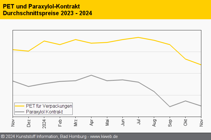 Der europäische PET-Markt zeigte sich im November 2024 sehr heterogen. Die europäischen Anbieter gingen taktisch unterschiedlich vor. Einige Erzeuger mit offensichtlich hohen Lagerbeständen ließen sich auf Preiskämpfe mit günstigeren Importen ein und winkten für Großabnehmer bis zu dreistellige Abschläge durch. Auf der anderen Seite gelang es Produzenten mit flexibleren Dispositionsmöglichkeiten, ihr Material mit deutlich geringeren Nachlässen bis hin zum Rollover im Markt zu platzieren.