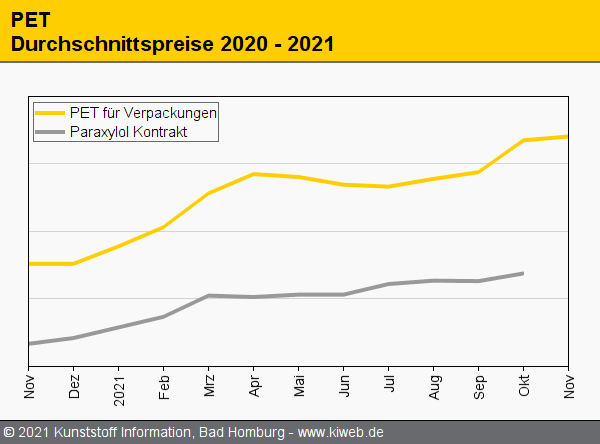 Nachfrageseitig ist im Dezember üblicherweise relativ wenig Bewegung zu erwarten. Angesichts der knappen Angebotslage könnte sich das diesmal jedoch ändern. Es werden bereits erste Vorfühlaktionen für den Frühjahrsbedarf gemeldet. Zugleich sind die extrem hohen Zuwächse bei den Kosten für Logistik und Energie bislang im PET-Sektor noch nicht eingepreist.