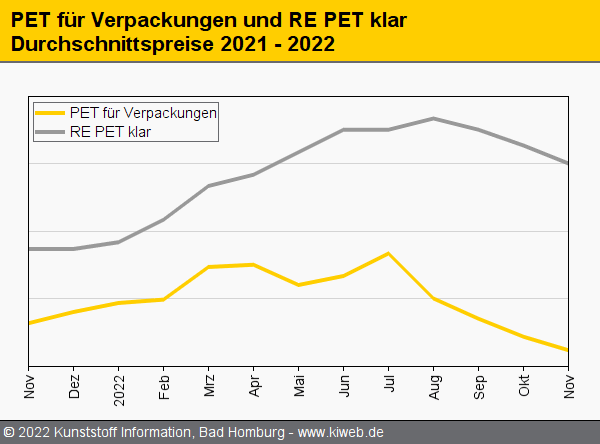 Die Situation im europäischen PET-Markt kann auch für den November 2022 nicht anders als miserabel genannt werden. Die Bemühungen der Produzenten um die Stabilisierung der Situation werden konterkariert von anhaltend schwacher Nachfrage und überproportional hohen Rohstoff- und Energiekosten. Hinzu kommen auf der anderen Seite aggressive Importe. So blieben die europäischen Anbieter trotz erheblich gedrosselter Produktion weiterhin auf den gefüllten Lagern sitzen. Die Notierungen verfielen im Monatsverlauf immer deutlicher. Dies berichtet der Branchendienst Kunststoff Information (Bad Homburg) im aktuellen Online-Report.