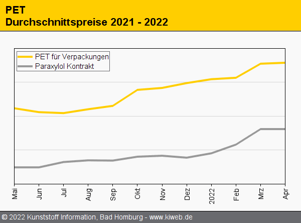 Die Verbraucherlaune ist durch die großen Unsicherheiten in den Keller gesaust, sie liegt derzeit sogar noch unterhalb der Lockdown-Flauten der beiden letzten Jahre. Die Ölpreise ließen parallel tendenziell etwas nach. Zudem verbreiteten sich Ankündigungen von PET-Importwaren aus Fernost für Mai und Juni. So entspannten sich die Käufer zusehends. Nur noch hier und da kam es in der Folge zu nachholenden Aufschlägen, insbesondere am unteren Rand der Bandbreite. Dies berichtet der Branchendienst Kunststoff Information (KI, Bad Homburg) im aktuellen Online-Report. Für den Mai deutet sich ein leichter Abwärtsdruck auf die Preise an. Die PX-Kontraktreferenz wurde nach dem Sprung im März für den April im Rollover fixiert, sodass von der Vorproduktseite her kein Kostendruck kommt.