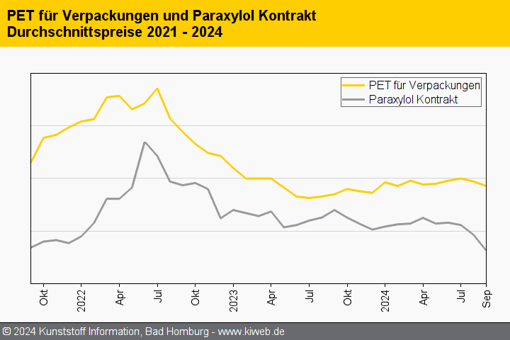 Der europäische PET-Markt wirkte im September 2024 bedrohlich ruhig. Angesichts der weiter flauen Endmärkte hielten sich die Käufer bei fallenden Vorproduktkosten sehr stark zurück. Zugleich sorgten Preisrückgänge in Asien und Nordamerika Hand in Hand mit signifikant sinkenden Logistikkosten auf den Weltmeeren für aggressive Importangebote. Die PX-Referenz stürzte geradezu um 105 EUR/t in die Tiefe. Dennoch gelang es den europäischen Produzenten, die wenigen tatsächlichen Geschäfte noch bei einem eher moderaten Minus zu halten.