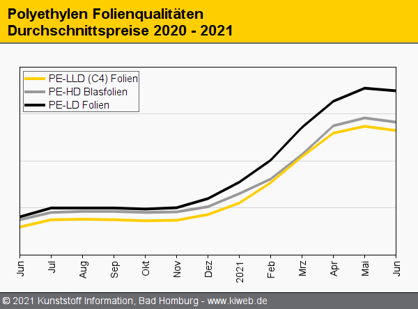 Das Gros der Notierungen für Polyethylen strebte im Juni 2021 dem Zenit entgegen. Nach der mehrmonatigen Hausse drehten PE-LD-Folien und mehrere PE-HD-Typen wieder nach unten, und andere Qualitäten mussten sich mit Aufschlägen unterhalb der C2-Kostensteigerung von 30 EUR/t begnügen. Preiserhöhungen auf dem Niveau der Monomerveränderung oder darüber gelangen den Erzeugern nur in den extrem unterversorgten Märkten für PE-LLD (C8), PE-HD Rohr und EVA. Dies berichtet der Branchendienst Kunststoff Information (KI, Bad Homburg) im aktuellen Online-Report.