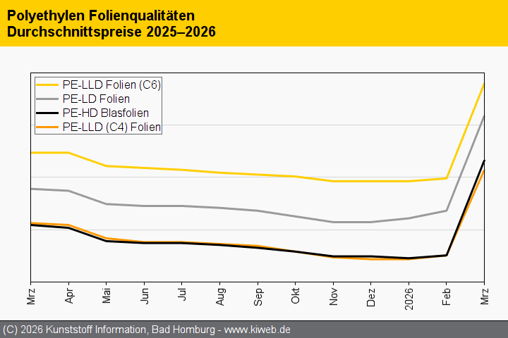Der Ethylenkontrakt verteuerte sich im März. Den eigentlichen dramatischen Kostendruck auf den Markt lösten jedoch der Iran-Krieg und die infolgedessen explodierenden Energie- und Rohstoffpreise aus. Unter der Eskalation im Nahost-Konflikt litt auch die Versorgungslage. Etliche Produzenten verhängten Orderstopps und boten Material zu tagesaktuell berechneten Preisen an.