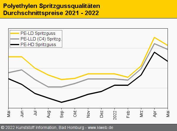 Über alle Typen hinweg gilt: Die Endverbraucher halten sich zurück und sind von den hohen Preisen abgeschreckt. Daher kaufen auch die Verarbeiter nur noch das Nötigste. Die Nachfrage ist im Mai deutlich gesunken. Spotpreise für PE fielen weit stärker als die Kontraktpreise. Allerdings waren auch die Handelsmengen nur marginal.