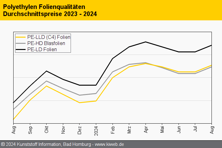 Die Verteuerung des C2-Kontrakts (+20 EUR/t) in Verbindung mit einer schlechten Margensituation und einer verhältnismäßig robusten Nachfrage ermöglichte es Anbietern, die Preise für Folienqualitäten deutlich anzuheben. Zugleich hielten sie vielfach an ihren Anlagendrosselungen fest. Zu frühen Orderstopps kam es dadurch zwar nicht. Dennoch verzögerten sich manche Lieferungen. Auf Nachfrageseite hatten einige Verarbeiter trotz der Ferienzeit ausreichend zu tun. Das hielt die Bedarfe vor allem im DACH-Raum auf einem überschaubar hohen, aber doch robusten Niveau.