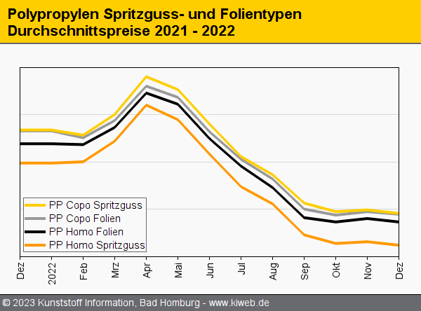 Was war das für ein Jahr 2022! Im vergangenen April hatte der Ukraine-Krieg die Preise für Polypropylen auf ein nie geahntes, geschweige denn gekanntes Allzeithoch geschossen – weit jenseits der 2.400 EUR/t. Ein Plus von 100 Prozent und mehr. Und dann die abrupte Trendwende: Seitdem kennen die Notierungen nur eine Richtung – talwärts. Wobei, wie im richtigen Leben, auch bei den Polymerpreisen alles relativ ist. Denn der Blick in die Chronologie der KI-Preisberichterstattung zeigt: Nach wie vor bewegen wir uns, verglichen mit den Vor-Corona-Notierungen, auf einem hohen Niveau. Dies berichtet der Branchendienst Kunststoff Information (KI, Bad Homburg) im aktuellen Online-Report.