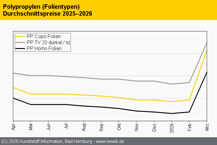 Auch der April wird weiter deutliche Anstiege bei den Notierungen sehen. Preistreiber sind die als sicher geltenden Verteuerungen bei Propylen, Energie und Transport. Zudem erwartet das KI-Panel eine spürbare Verengung des Marktes.