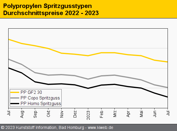 Weiter nach unten. Bei den Preisen für Polypropylen hat sich der Abwärtstrend der vergangenen Monate im Juli 2023 fortgesetzt. Erneut waren es die rückläufigen C3-Kosten (-50 EUR/t) und die schwache Nachfrage, die die Notierungen unter Druck setzten. Allerdings gab es auch einige Aspekte, die anders sind als in den Monaten zuvor: So haben sich die Preise für PP Copo von den Homo-Materialien im Zuge einer unterschiedlichen Versorgungslage entkoppelt – bei PP Homo gingen die Abschläge in der Regel über die C3-Reduktion hinaus, während sie bei den Copo-Werkstoffen deutlich näher an der Monomerveränderung orientierten.