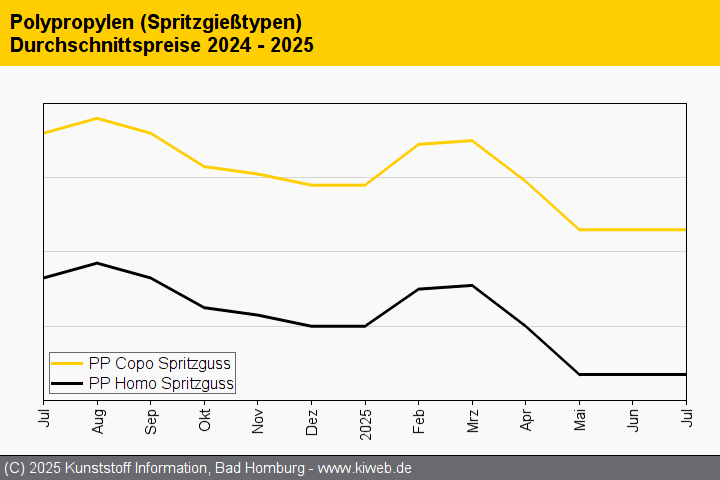 Am Markt für Polypropylen verlief der Juli 2025 ohne nennenswerte Preisbewegungen. Nach dem neuerlichen Rollover des Vorprodukts Propylen wurden auch die PP-Preise in der Regel auf dem Vormonatsniveau fortgeschrieben. Nur in wenigen Fällen konnten Verarbeiter den Anbietern minimale Preisanpassungen nach unten abringen. Dies war insbesondere bei den talkumgefüllten PP-Compounds der Fall. Die ohnehin schon flaue Nachfrage erhielt einen zusätzlichen Dämpfer durch den Beginn der Urlaubszeit, während derer viele Verarbeiter die Produktion einstellten und Wartungen vornahmen.