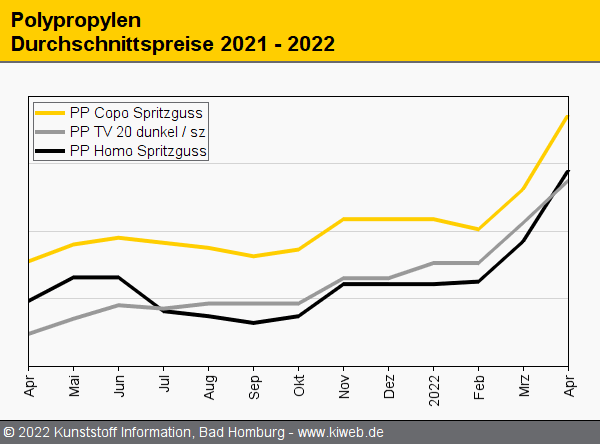 Der massive Anstieg der C3-Referenz im April (+225 EUR/t) ließ die Preise für Polypropylen auf neuerliche Allzeithochs schießen. Die Produzenten versuchten, neben dem C3-Aufschlag auch die gestiegenen Energiekosten einzupreisen. Dagegen sträubten sich aber die Verarbeiter, zumal die Energiekosten im weiteren Monatsverlauf wieder nachgaben. Ein Quasi-Bestellboykott brachte auch die PP-Notierungen zum Bröckeln. Ohnehin gestaltete sich die Nachfrage eher mau. Im Spritzgießbereich machen sich die Produktionsabstellungen von Automobilbauern bemerkbar. Im Foliensektor hielten sich die Verarbeiter mit ihren Ordern ebenfalls zurück, da sie auf günstigere Preise im Mai hofften. Dies berichtet der Branchendienst Kunststoff Information (KI, Bad Homburg) im aktuellen Online-Report.