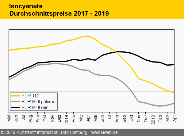 Bei den PUR-Komponenten setzten die Isocyanate ihre Bewegungen aus dem Vormonat weitgehend fort. Die Notierungen für MDI polymer festigten sich im April etwas deutlicher als erwartet, jedoch nicht gänzlich überraschend. TDI stand noch immer unter dem Druck einer sehr schwachen Auto-Nachfrage. Dies berichtet der Branchendienst Kunststoff Information (KI, Bad Homburg) im aktuellen Online-Report.