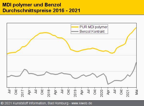 Mit Ausnahme von TDI schraubten sich alle Preise für Polyurethan-Komponenten im Mai weiter nach oben. Die Verfügbarkeit insbesondere bei den Polyolen, aber auch bei MDI war für eine andere Entwicklung zu dünn. Die Unterversorgung bei Polyolen deckelte die verarbeiteten Mengen zudem.