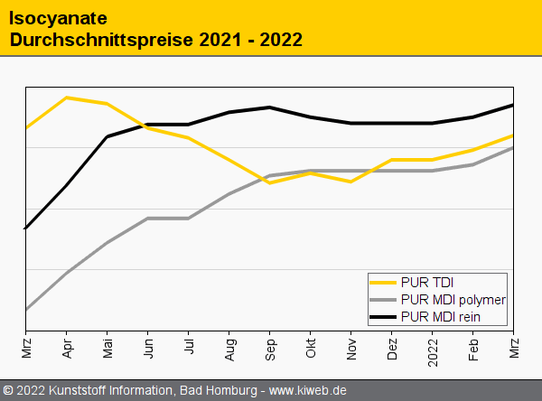 Bei den Isocyanaten blieben die Preise während der ersten Märzhälfte noch weitgehend am oder nahe eines Rollover. Ab der Monatsmitte traten Erzeuger jedoch erstmals breitflächig mit Energiezuschlägen auf den Plan. Damit zogen die Preise sowohl bei MDI als auch bei TDI spürbar an. Dies berichtet der Branchendienst Kunststoff Information (KI, Bad Homburg) im aktuellen Online-Report. In Westeuropa herrschte eine deutlich spürbare, verhaltene Nachfrage, in Osteuropa dagegen kam es zu einer verstärkten Ordertätigkeit. Grund war die erhöhte Nachfrage nach Matratzen für die Flüchtlinge aus der Ukraine seitens der Hilfsorganisationen.