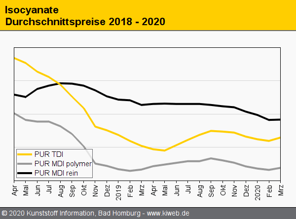 Der Einfluss des Coronavirus dürfte im April auch Wirkung auf die Isocyanate zeigen. Die Entwicklung ist kaum zu prognostizieren, doch wird der Abfluss in verbrauchernahe Segmente wohl ins Stocken oder sogar zum Erliegen kommen. Da die Schließungen erster Werke bei Automobilzulieferern erst gegen Ende März erfolgten, könnte die Nachfrage nach technischen Produkten hingegen möglicherweise noch ein wenig weiter tragen.