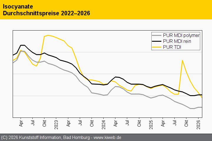 Trotz des im Februar um 130 EUR/t festeren europäischen Benzolkontrakts kamen die berichteten PUR-Komponenten in den meisten Fällen nicht über einen Rollover hinaus. Allerdings weiteten sich die Bandbreiten für die Mehrzahl der Vorprodukte spürbar aus: Teilweise waren sowohl vereinzelte Abschläge wie auch Aufschläge zu sehen, die allerdings noch keinen allgemeinen Trend manifestieren konnten. Einzig TDI blieb deutlich unter Druck, der sich wohl auch im März fortsetzen wird.