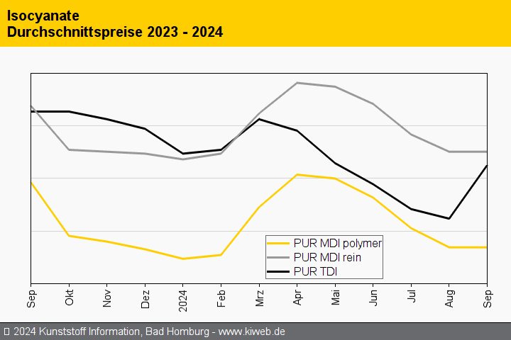 Die Mehrzahl der Notierungen für PUR-Vorprodukte zeigte im September 2024 einen Rollover. Bei MDI erstickten gute Verfügbarkeit und schwache Nachfrage Preisanhebungsversuche im Keim. Die Nachfrage zeigte sich zum Ende der Ferienzeit kaum verbessert. Erzeuger werden in den kommenden Wochen erneut versuchen, höhere Preise am Markt zu platzieren. Dies dürfte jedoch höchstens bei Quartalskontrakten und auch nur in Ansätzen gelingen.
